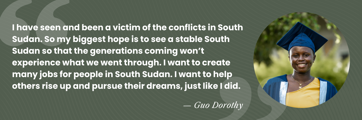 Looking toward the future, Dorothy has big dreams not just for herself but for her country. She envisions a South Sudan that is politically, economically, and socially stable. “I have seen and been a victim of the conflicts in South Sudan. So my biggest hope is to see a stable South Sudan so that the generations coming won’t experience what we went through. I don’t want them to run as refugees,” she says with a sense of urgency.