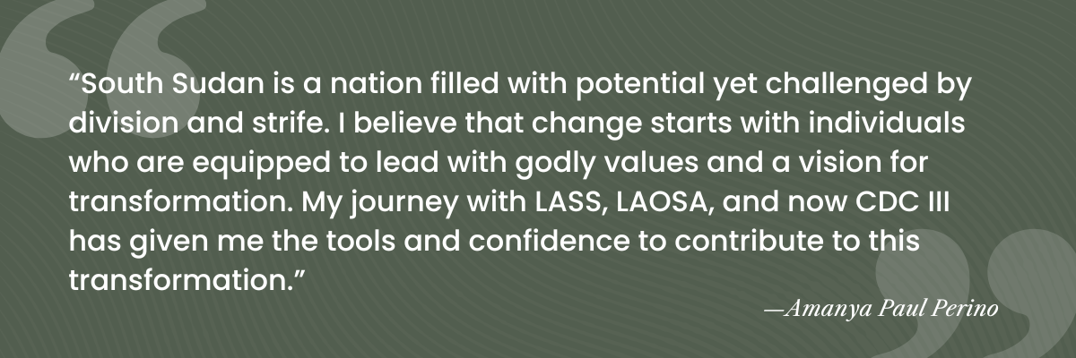 “South Sudan is a nation filled with potential yet challenged by division and strife. I believe that change starts with individuals who are equipped to lead with godly values and a vision for transformation. My journey with LASS, LAOSA, and now CDC III has given me the tools and confidence to contribute to this transformation.”