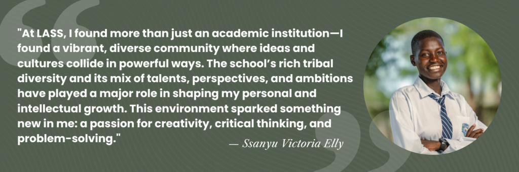 Now a Senior Six (second year) at LASS, Ssanyu has discovered more than an academic institution—she became a member of the vibrant, diverse community where ideas and cultures collide in powerful ways. The academy’s rich tribal diversity and its mix of talents, perspectives, and ambitions have played a major role in shaping her personal and intellectual growth. For Ssanyu, this environment sparked something new: a passion for creativity, critical thinking, and problem-solving.